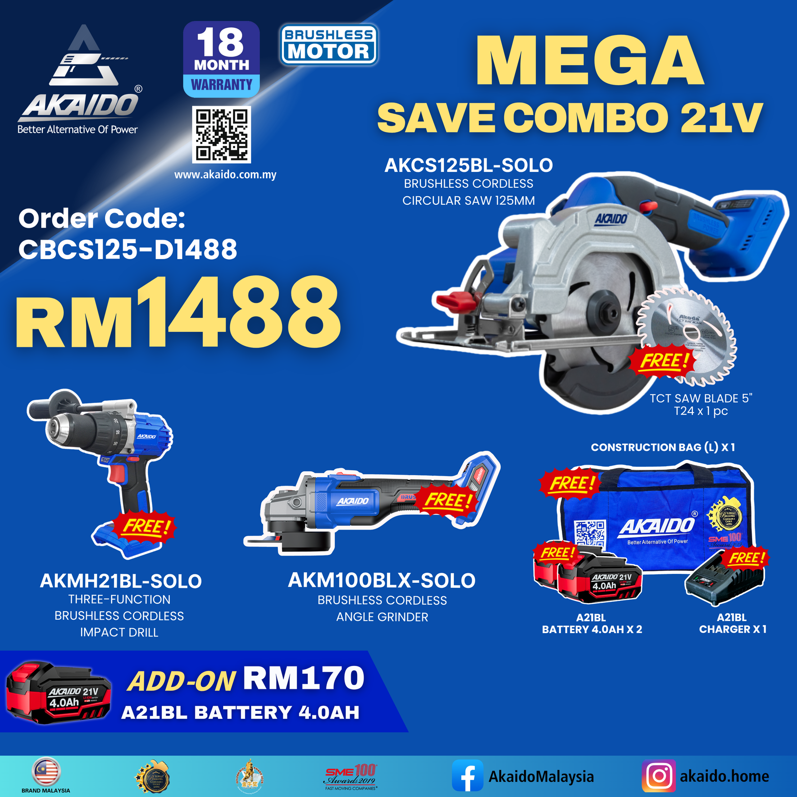 This package includes : BRUSHLESS CORDLESS CIRCULAR SAW AKCS125BL - SOLO x 1 :4" AKODA TCT SAW BLADE 30T - 1 PCS :4" AKODA DIAMOND BLADE WET (A5) - 1 PCS THREE FUNCTION BRUSHLESS CORDLESS IMPACT AKMH21BL - SOLO x 1 BRUSHLESS CORDLESS ANGLE GRINDER AKM100BLX - SOLO x 1 A21BL BATTERY 4.0AH x 2 A21BL CHARGER x 1 CONSTRUCTION BAG (L) x 1