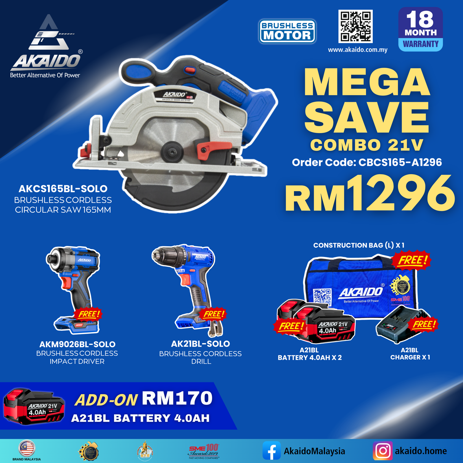 The AKAIDO MEGA SAVE COMBO - CBCS165-A1266 is the perfect set for all your power tool needs. This package includes three top-of-the-line products: This Package Includes: BRUSHLESS CORDLESS CIRCULAR SAW AKCS165BL - SOLO x 1 BRUSHLESS CORDLESS DRILL AK21BL - SOLO x 1 BRUSHLESS CORDLESS IMPACT DRIVER AKM9021BL(V2) - SOLO x 1 A21BL BATTERY 4.0AH x 2 A21BL CHARGER x 1 CONSTRUCTION BAG (L) x 1 Each tool in this set boasts advanced brushless technology, ensuring powerful and efficient performance every time you use them. The circular saw is cordless for easy maneuverability, while the drill and impact driver both offer cordless convenience as well. This set comes with a Supplier Warranty that lasts for an impressive 18 months. The Input Voltage(V) of these tools is/are 21, providing ample power to tackle even the toughest jobs.