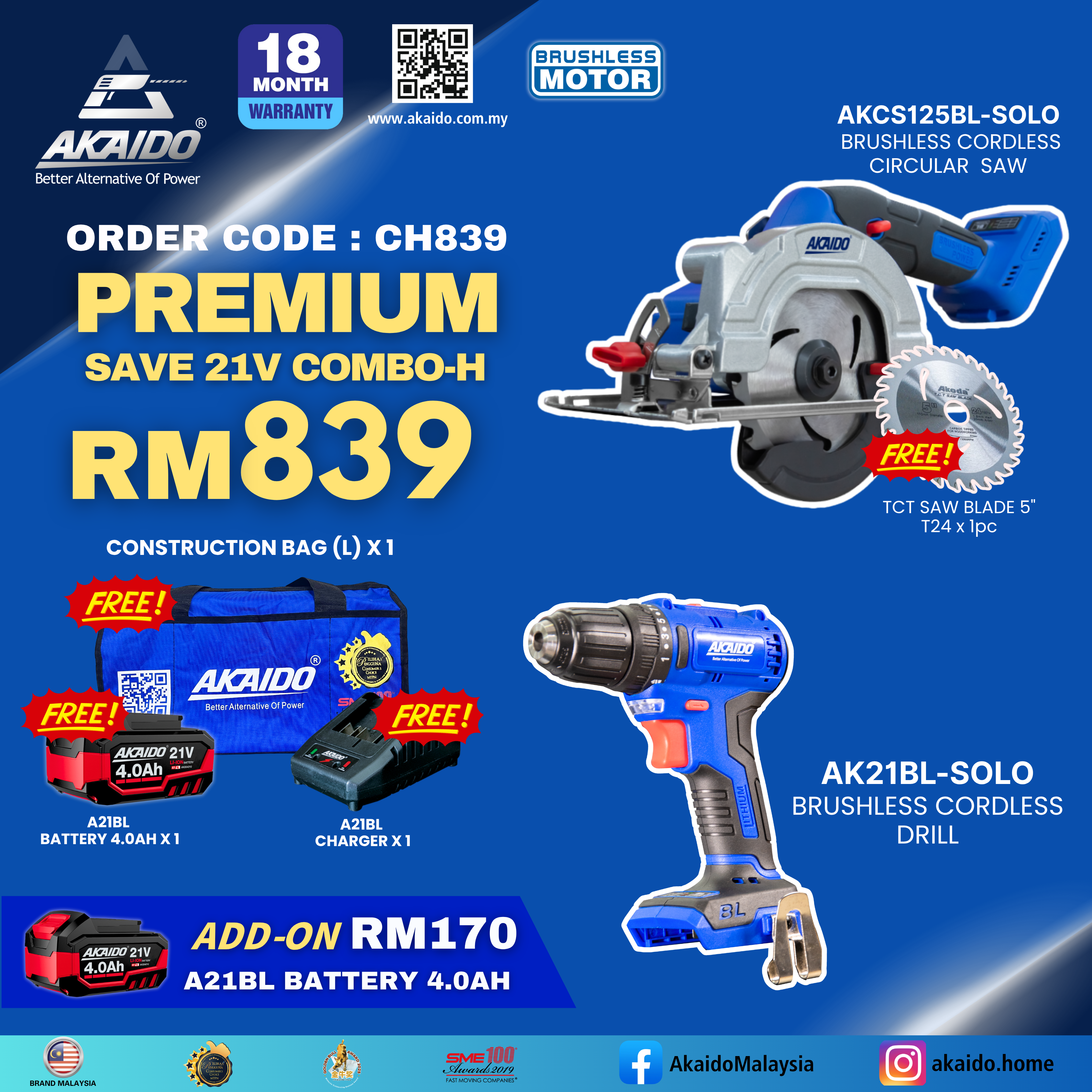 The AKAIRO PREMIUM COMBO - CH839 power tool set is perfect for both professional and DIY enthusiasts who need reliable and high-quality tools for their projects. This combo kit includes a brushless cordless drill AK21BL-10MM, a brushless cordless circular saw AKCS125BL, an A21BL battery 4.0 AH, an A21BL charger, and a construction bag (L).