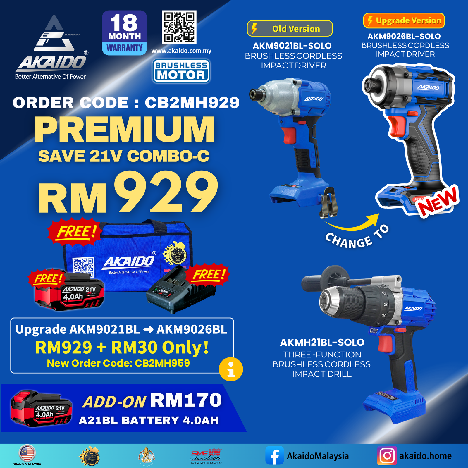 Elevate your power tool game with the AKAIDO PREMIUM SAVE COMBO - CB2MH929, a comprehensive set of tools designed for heavy-duty construction work.